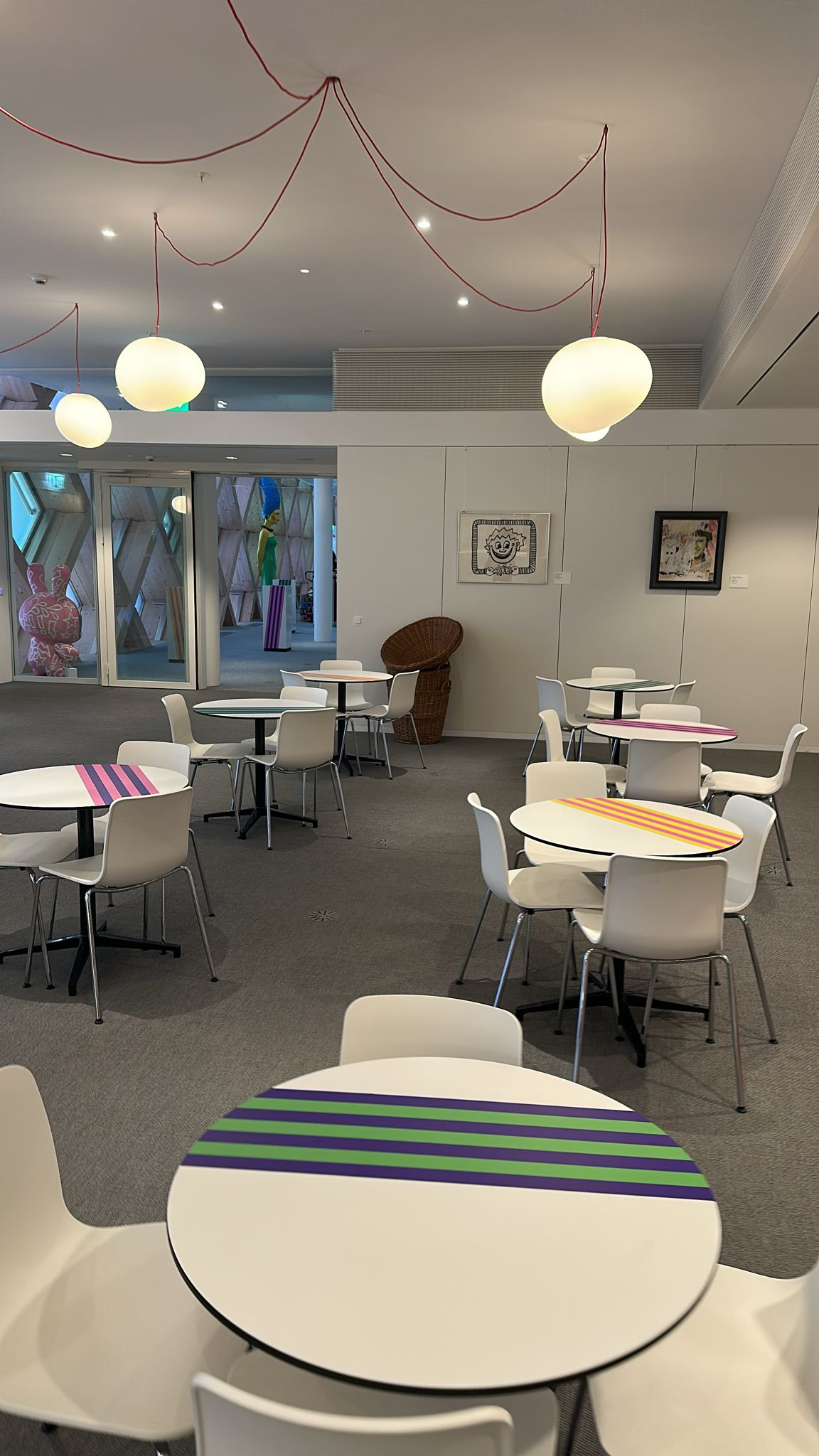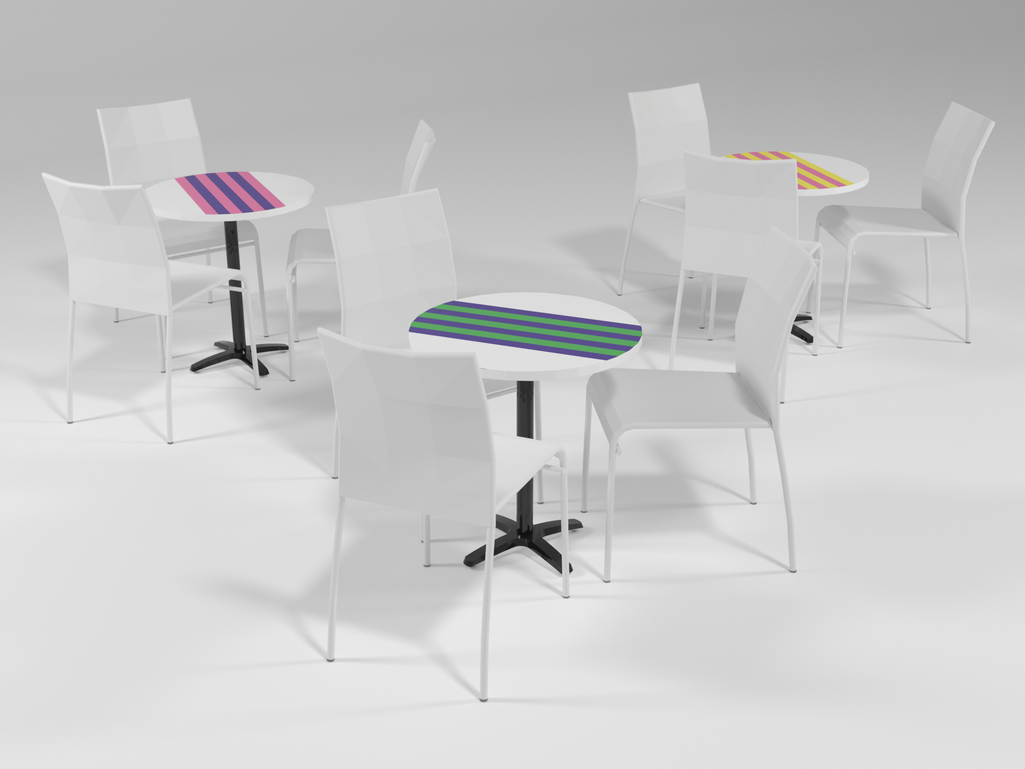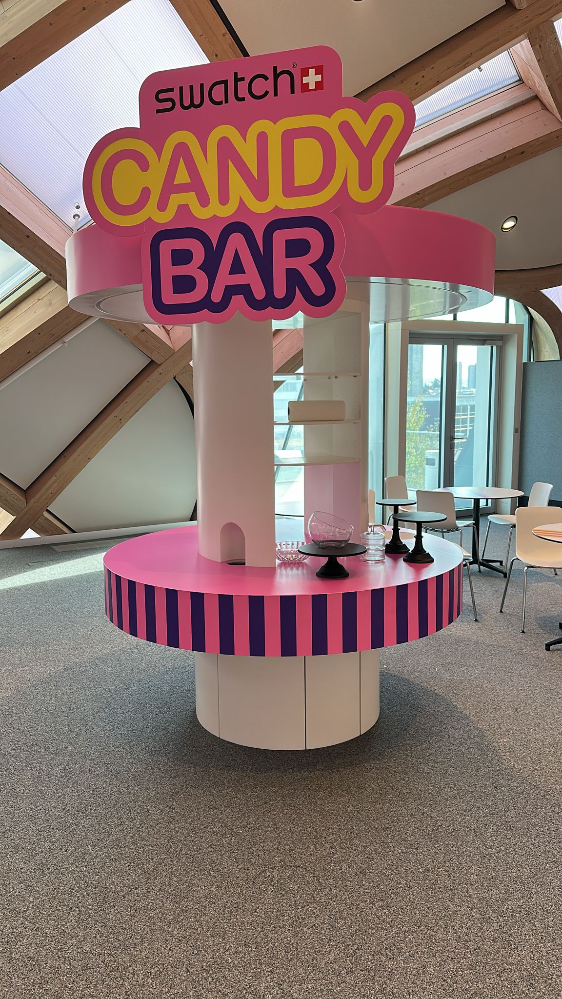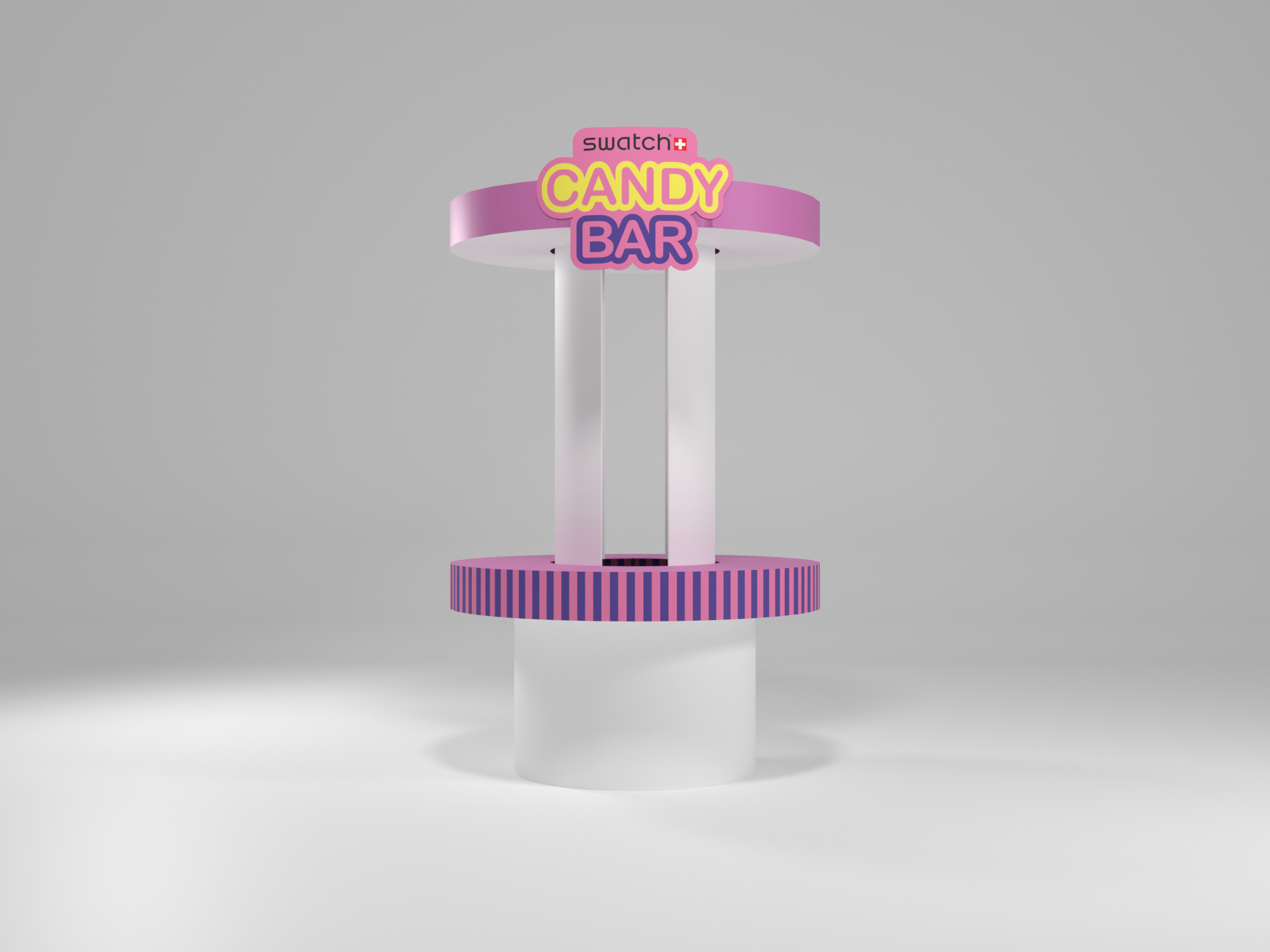 The stage design featured a giant charm bracelet wrapping around three towers of varying height, composed of different-sized blocks and cylinders. I also designed two smaller signage towers in the same style to guide visitors around the event space. Additionally, I produced visuals of existing furniture adorned with multi-coloured stripes, in line with the event’s playful theme.